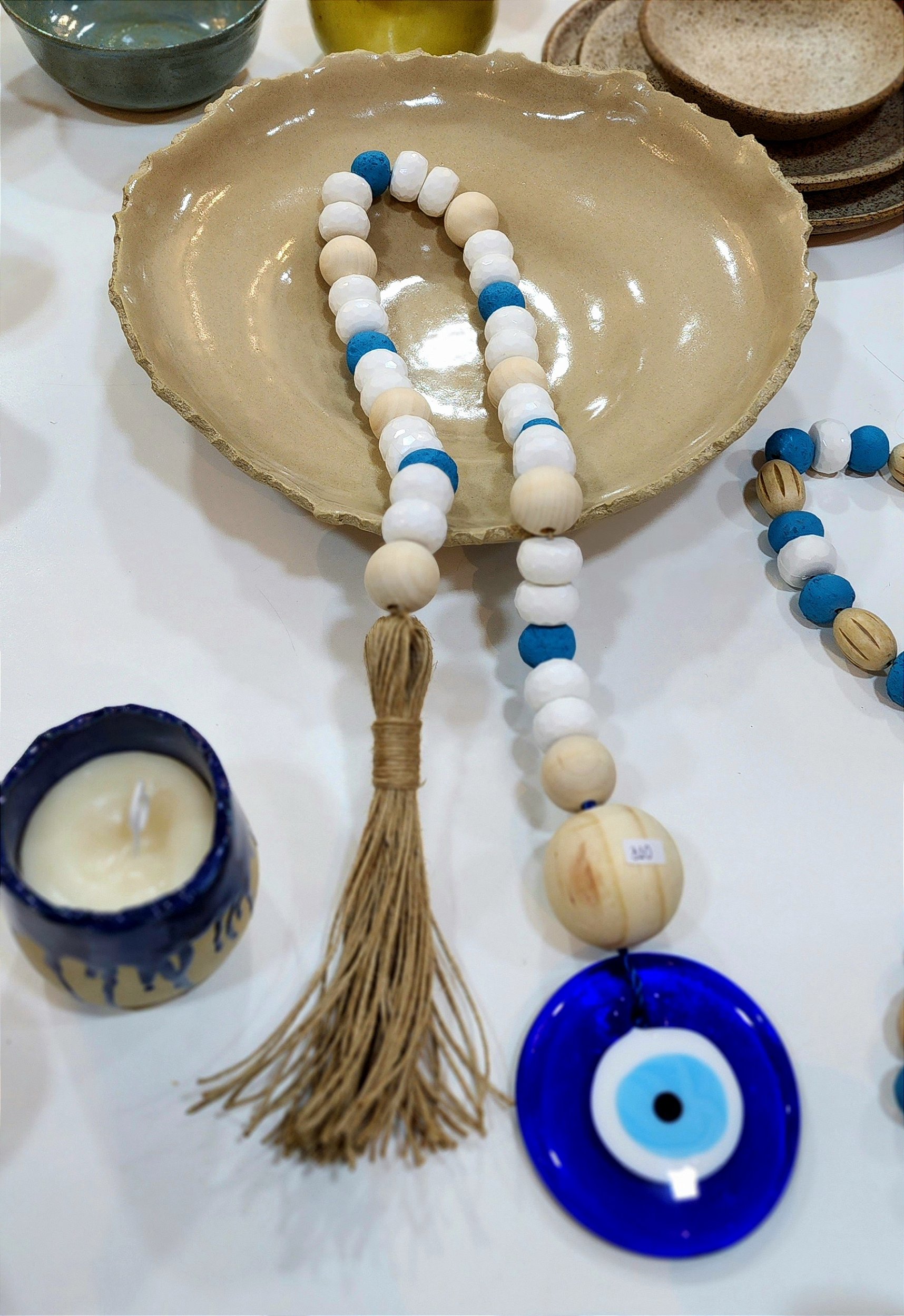 Esta peça torna seu ambiente mais afetivo e cheio de estilo, além de ter um design super delicado. Estruturado em esferas de madeira, argila, finalizados com tassel de sisal e olho grego de vidro, proporcionando um visual diferenciado para sua mesa, parede, ou aparador. Além disso, o acabamento com tassel é charmoso e dá um toque boêmio à peça.